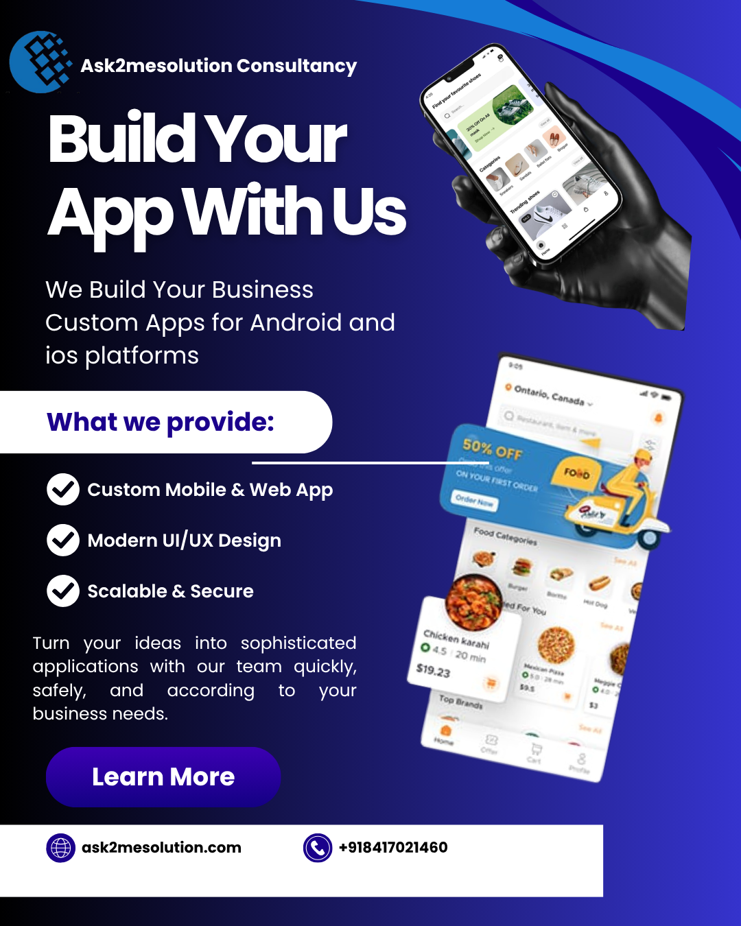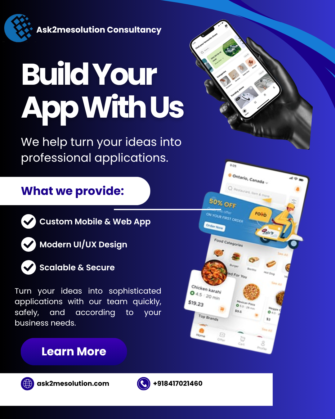 We design & develop Websites, Mobile Apps, Enterprise Software (ERP, CRM, HRM), E-commerce Platforms, Delivery Apps, Blockchain Solutions, AI Tools, and Digital Marketing Services—all under one roof!💡 Let’s turn your idea into reality